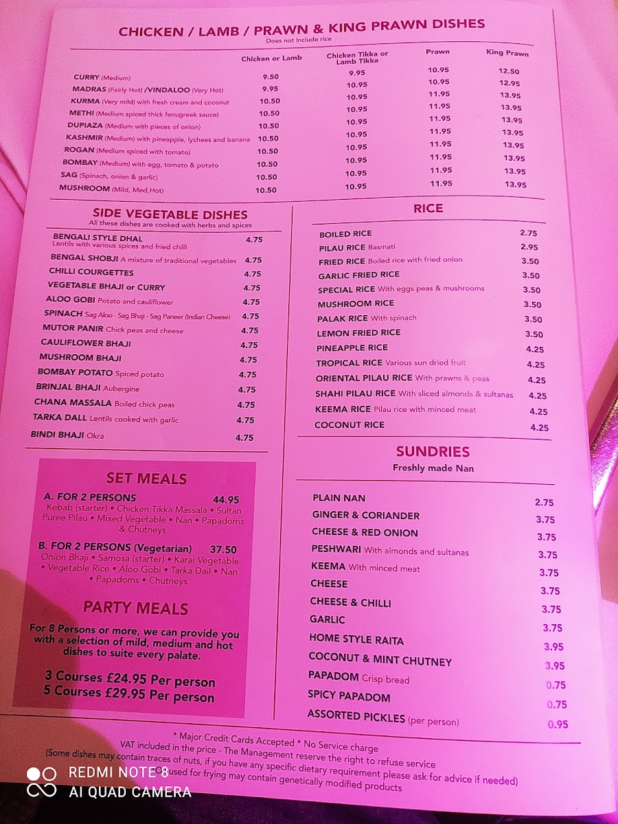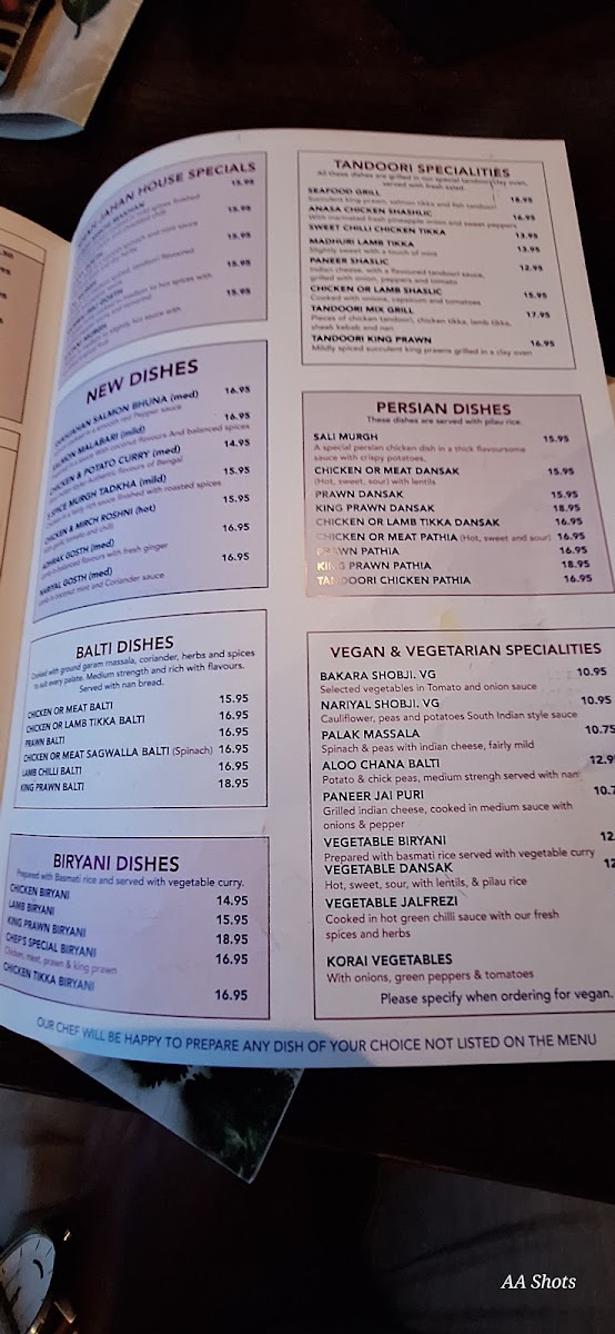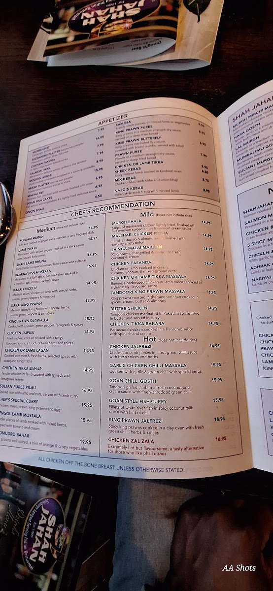 The Shah Jahan Menu presents an extensive range of options, from rich curries to sizzling grills. The starters include classics like Samosas, Onion Bhajis, and Pakoras, all bursting with spices that set the tone for the main courses. For mains, you can choose from a wide variety of dishes, with the Chicken Tikka Masala and Lamb Rogan Josh being popular choices. The Shah Jahan Special offers an indulgent selection of slow-cooked meats and aromatic spices, giving you a taste of the restaurant's unique style. Vegetarians are also well catered for, with dishes such as Dal Tadka and Aloo Gobi satisfying the most discerning palates.